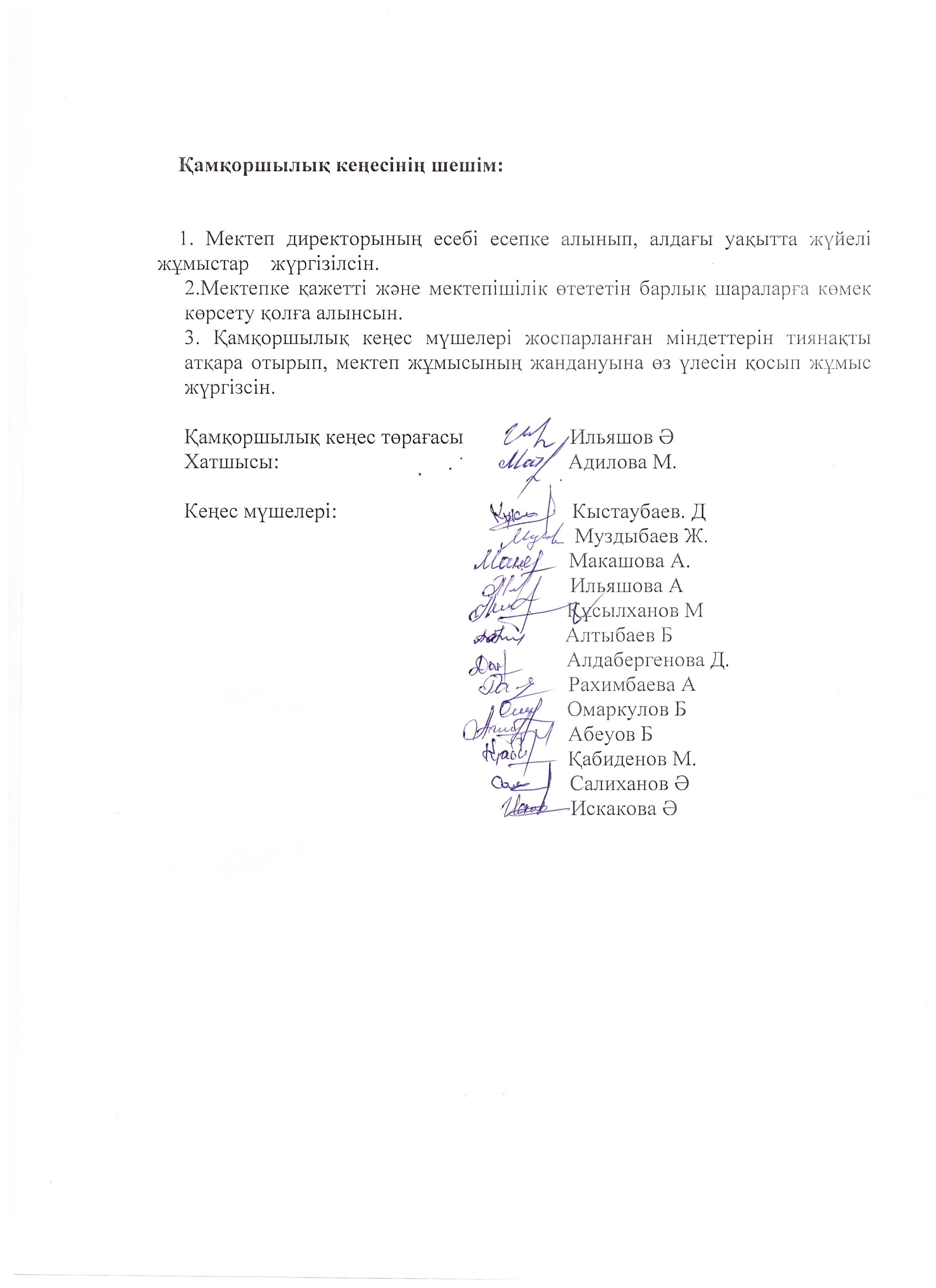 Екінші мәселе бойынша Қамқоршылық кеңес төрағасы Ильяшов Әділ сөз алды. Ол мектептегі қамқоршылық мүшелерімен бірлесе отырып, 2017-2018 оқу жылына жоспар құрылып, бекітілгенін айтты. Кеңес мүшелері «Қайырымдылық» акциясына отбасы күніне, жаңа жылда және басқа да мектепте өтетін шаралардың өтуіне өз көмектетерін көрсетіп отырды. «Қарқаралы ауданының білім бөлімі» ММ – сінің 08.02.2017 жылғы №01.1-02/272 хатына сәйкес көп балалы, толық емес отбасы балалары Астана қаласында 2017 жылдың 10-13 тамыз күндері аралығында «ЭКСПО-2017» халықаралық 1 оқушы, маусым айында қала сыртындағы «Березка» жазғы сауықтыру лагеріна 3 оқушы тартылды. Биылғы жылы өткен аудан әкімінің шыршасына 2 оқушы қатысып, сыйлықтарын алып қайтты. Биылғы жылғы ерекшеліктің бірі 1-9 сыныптар 5 күндік оқу аптасына көшуге Қамқоршылық кеңесі және мектеп әкімшілігі өз ұсыныстарын білдіріп, сабақтың ұзақтығы 40 минут, қосымша сабақты сенбі күні жүргізуге шешім қабылдадық. Аудандық, облыстық байқауларға оқушыларды жіберуге өз көмектерімізді көрсеттік.