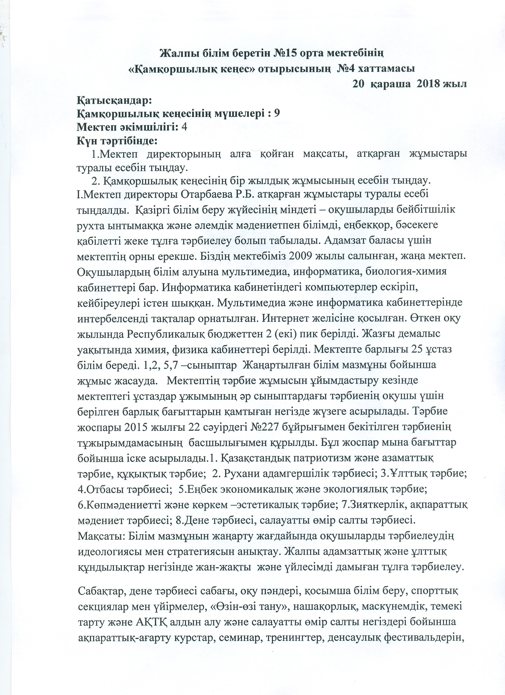 І.Мектеп директоры Отарбаева Р.Б. атқарған жұмыстары туралы есебі тыңдалды. Еліміздің Президенті Н.Ә.Назарбаев Қазақстан халқына арнаған жолдауында «Ең алдымен білім беру жүйесінің ролі өзгеруі тиіс. Біздің міндетіміз – білім беруді экономикалық өсудің жаңа моделінің орталық буынына айналдыру. Оқыту бағдарламаларын сыни ойлау қабілетін және өз бетімен іздену дағдыларын дамытуға бағыттау қажет» -деп атап көрсетті. Қазіргі білім беру жүйесінің міндеті – оқушыларды бейбітшілік рухта ынтымаққа және әлемдік мәдениетпен білімді, еңбекқор, бәсекеге қабілетті жеке тұлға тәрбиелеу болып табылады. Адамзат баласы үшін мектептің орны ерекше. Біздің мектебіміз 2009 жылы салынған, жаңа мектеп. Оқушылардың білім алуына мультимедиа, информатика, биология-химия кабинеттері бар. Информатика кабинетіндегі компьютерлер ескіріп, кейбіреулері істен шыққан. Мультимедиа және информатика кабинеттерінде интербелсенді тақталар орнатылған. Интернет желісіне қосылған. Биылғы жылы Республикалық бюджеттен 2 (екі) пик берілді. Мектепте барлығы 24 ұстаз білім береді. 1,2, 5,7 –сыныптар Жаңартылған білім мазмұны бойынша жұмыс жасауда. Мектептің тәрбие жұмысын ұйымдастыру кезінде мектептегі ұстаздар ұжымының әр сыныптардағы тәрбиенің оқушы үшін берілген барлық бағыттарын қамтыған негізде жүзеге асырылады. Тәрбие жоспары 2015 жылғы 22 сәуірдегі №227 бұйрығымен бекітілген тәрбиенің тұжырымдамасының басшылығымен құрылды. Бұл жоспар мына бағыттар бойынша іске асырылады.1. Қазақстандық патриотизм және азаматтық тәрбие, құқықтық тәрбие; 2. Рухани адамгершілік тәрбиесі; 3.Ұлттық тәрбие; 4.Отбасы тәрбиесі; 5.Еңбек экономикалық және экологиялық тәрбие; 6.Көпмәдениетті және көркем –эстетикалық тәрбие; 7.Зияткерлік, ақпараттық мәдениет тәрбиесі; 8.Дене тәрбиесі, салауатты өмір салты тәрбиесі. Мақсаты: Білім мазмұнын жаңарту жағдайында оқушыларды тәрбиелеудің идеологиясы мен стратегиясын анықтау. Жалпы адамзаттық және ұлттық құндылықтар негізінде жан-жақты және үйлесімді дамыған тұлға тәрбиелеу.