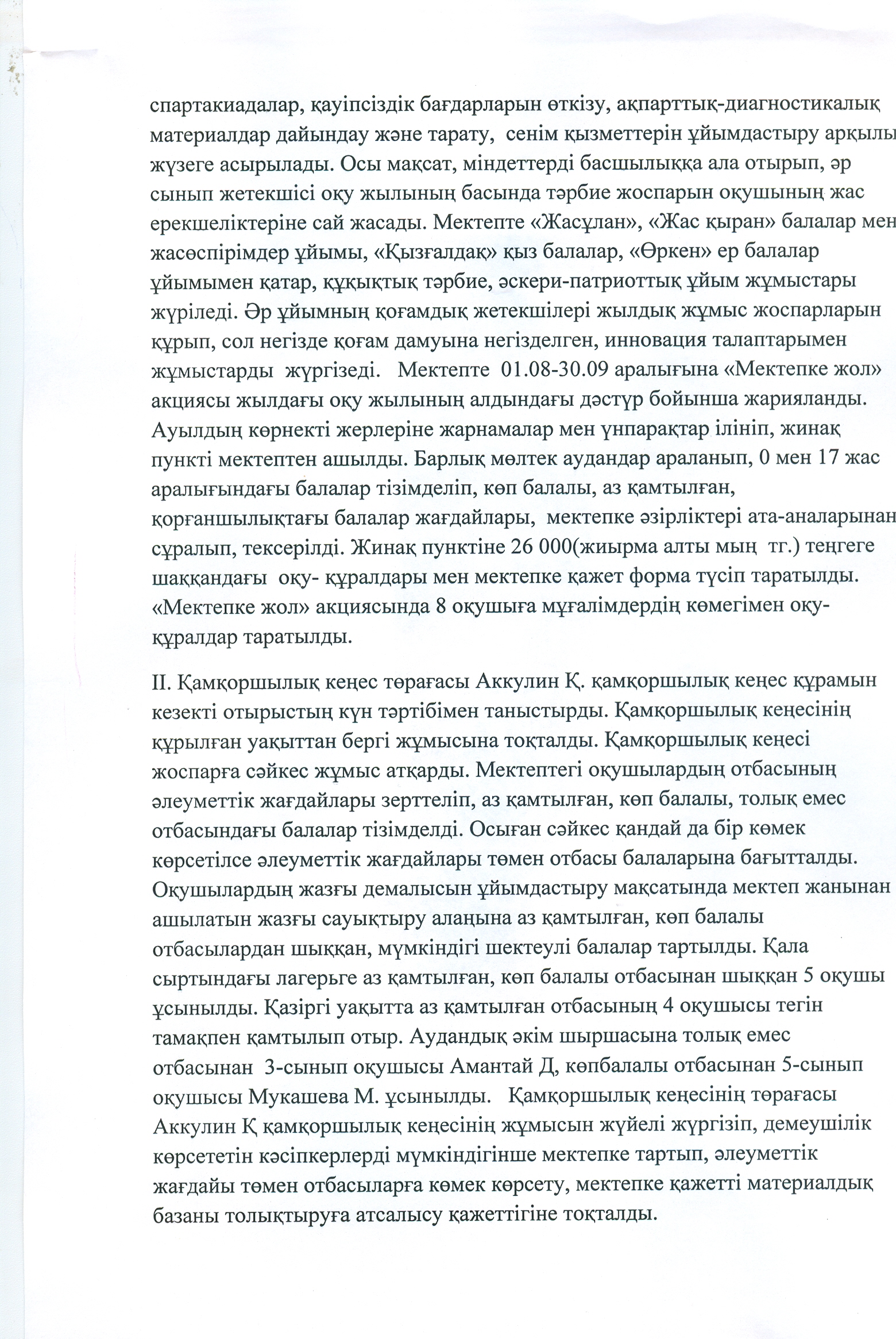 ІІ. Қамқоршылық кеңес төрағасы Жөргембаев А.Б. қамқоршылық кеңес құрамын кезекті отырыстың күн тәртібімен таныстырды. Қамқоршылық кеңесінің құрылған уақыттан бергі жұмысына тоқталды. Қамқоршылық кеңесі жоспарға сәйкес жұмыс атқарды. Мектептегі оқушылардың отбасының әлеуметтік жағдайлары зерттеліп, аз қамтылған, көп балалы, толық емес отбасындағы балалар тізімделді. Осыған сәйкес қандай да бір көмек көрсетілсе әлеуметтік жағдайлары төмен отбасы балаларына бағытталды. Оқушылардың жазғы демалысын ұйымдастыру мақсатында мектеп жанынан ашылатын жазғы сауықтыру алаңына аз қамтылған, көп балалы отбасылардан шыққан, мүмкіндігі шектеулі балалар тартылды. Қала сыртындағы лагерьге аз қамтылған, көп балалы отбасынан шыққан 5 оқушы ұсынылды. «Қарқаралы ауданының білім бөлімі» ММ-нің 08.02.2017 жылғы №01.1-02/272 бұйрығына сәйкес мектептегі аз қамтылған, көпбалалы, мүмкіндігі шектеулі балалар арасынан 2 оқушы Астана қаласына 2017 жылдың 10-13 тамыз күндері аралығында «ЭКСПО-2017» халықаралық көрмесіне барып қайтты. «Мектепке жол» акциясында 7 оқушыға мұғалімдердің көмегімен оқу-құралдар таратылды. Қазіргі уақытта аз қамтылған отбасының 6 оқушысы тегін тамақпен қамтылып отыр. Аудандық әкім шыршасына аз қамтылған отбасынан 9-сынып оқушысы Фауеден Төлеужан, 1-сыныптан мүмкіндігі шектеулі Жексенхан Алтынай барып, сыйлықтарын алып қайтты. Сонымен қатар қамқоршылық кеңес мүшесі Аккулин Қ мектептегі «Балдырған» шағын орталығына бүлдіршіндердің құрастыру сабағына қажетті конструктор ойыншығын сыйлады. Қамқоршылық кеңесінің төрағасы Жөргембаев А.Б: қамқоршылық кеңесінің жұмысын жүйелі жүргізіп, демеушілік көрсететін кәсіпкерлерді мүмкіндігінше мектепке тартып, әлеуметтік жағдайы төмен отбасыларға көмек көрсету, мектепке қажетті материалдық базаны толықтыруға атсалысу қажеттігіне тоқталды.
