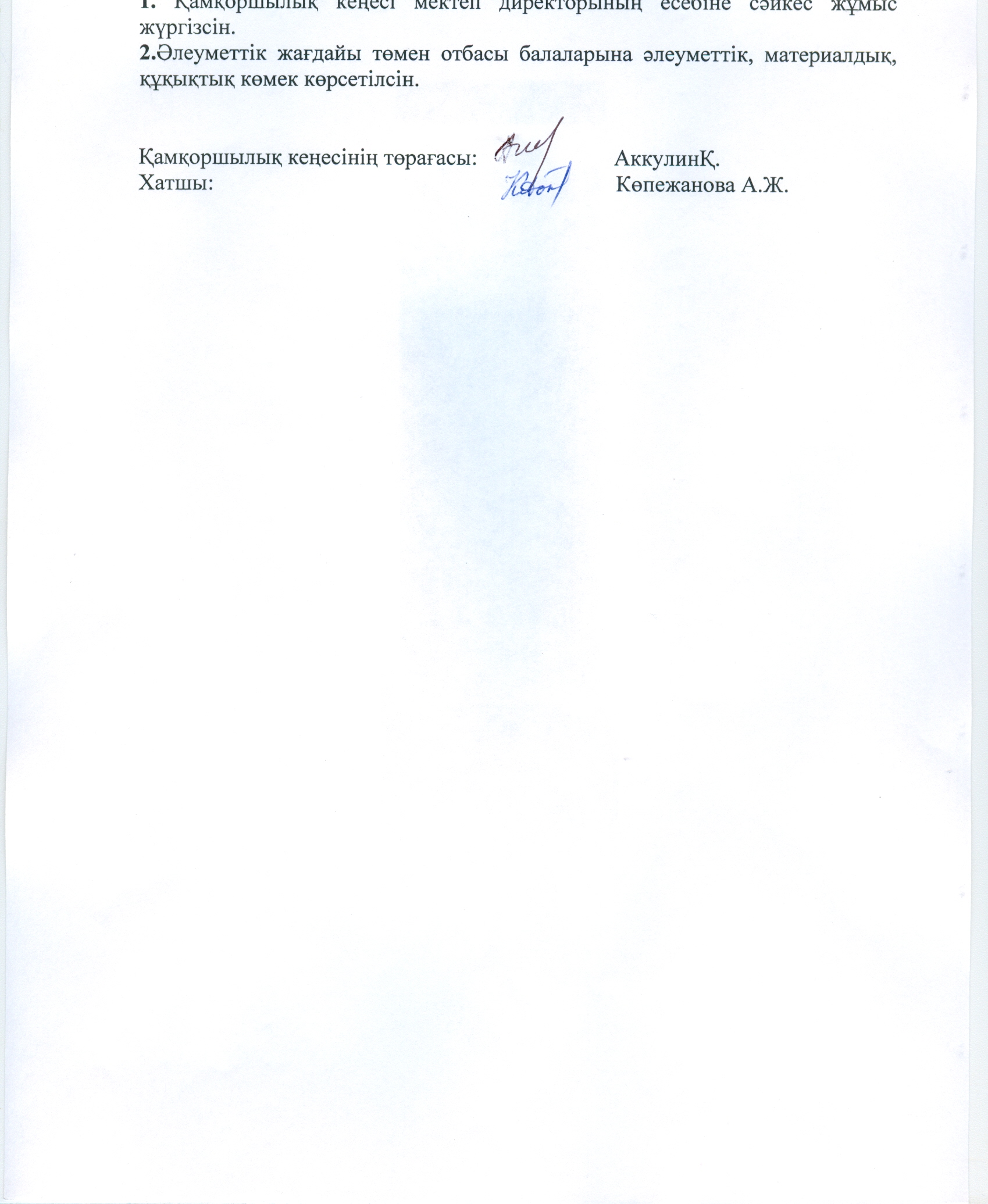 1. Қамқоршылық кеңесі мектеп директорының есебіне сәйкес жұмыс жүргізсін.